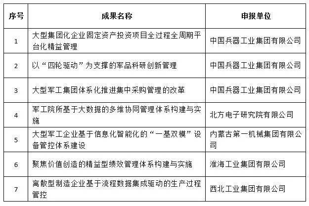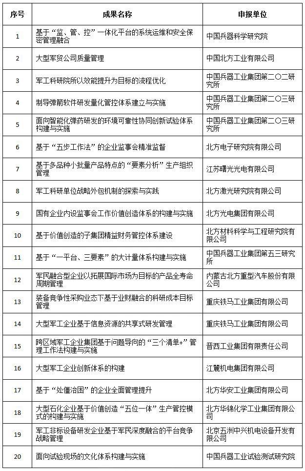 近日,中國兵器工業集團4項創新成果獲全國企業管理現代化創新成果獎、42項創新成果獲國防科技工業企業管理創新成果獎。 全國企業管理現代化創新成果 經全國企業管理現代化創新成果審定委員會終審,第二十五屆全國企業管理現代化創新成果公布,中國兵器工業集團4項創新成果榮獲二等獎。 二等獎 國防科技工業企業管理創新成果 2018年度國防科技工業企業管理創新獲獎成果名單發布,中國兵器工業集團共獲獎42項,其中:一等獎7項,二等獎15項,三等獎20項。獲獎總量及一等獎數量均位于軍工集團首位。 一等獎 二等獎 三等獎 據悉,2018年度的國防科技工業企業管理創新評審工作,經專家初審、函審、一等獎候選成果答辯、專家會議評審、評審委員會審核并公示后,評選出一批在履行強軍首責、全面貫徹創新驅動發展戰略和全面深化改革、高質量發展等方面的優秀成果。本年度共確定獲獎成果307項,其中一等獎44項,二等獎126項,三等獎137項。 |