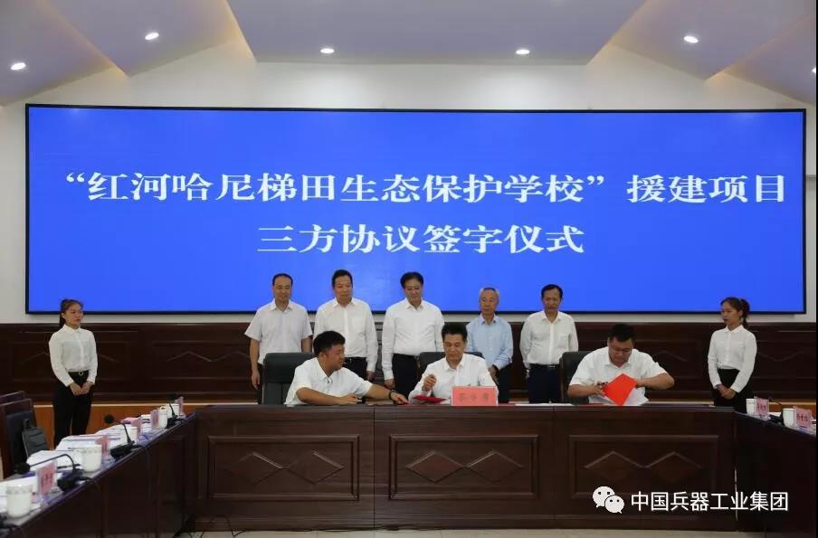 會上,兵器工業(yè)集團、中國扶貧基金會和紅河縣簽署了“紅河哈尼梯田生態(tài)保護學(xué)校”援建項目三方協(xié)議。