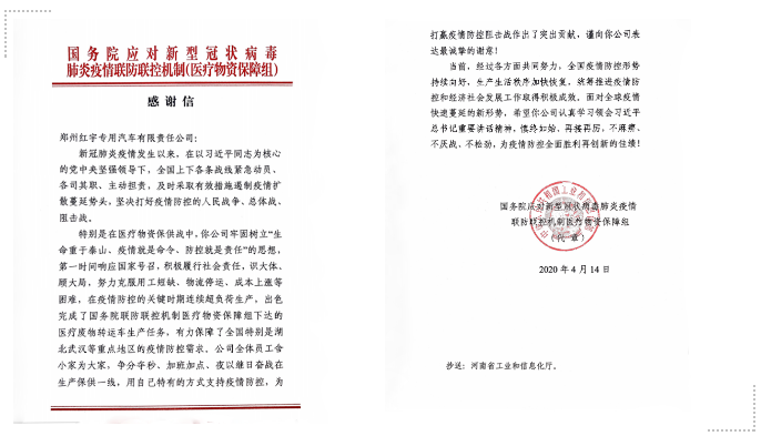 豫西集團鄭州紅宇專汽公司收到國務院應對新型冠狀病毒肺炎疫情聯防聯控機制醫療物資保障組發來的感謝信