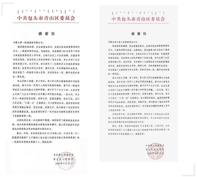 一機集團和北重集團收到中共包頭市青山區委員會、青山區人民政府發來的感謝信和慰問信