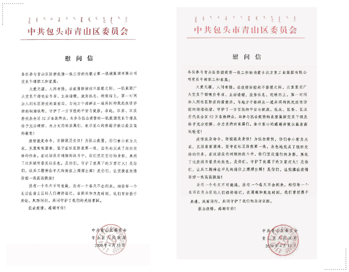 一機集團、北重集團收到中共包頭市青山區委員會、青山區人民政府發來的慰問信
