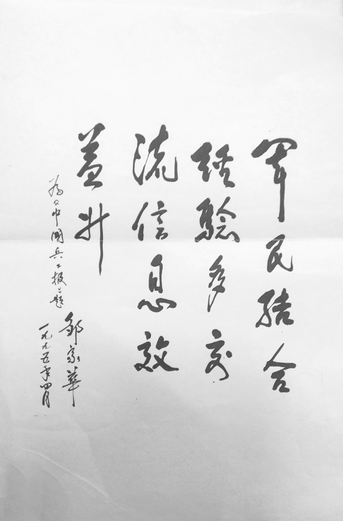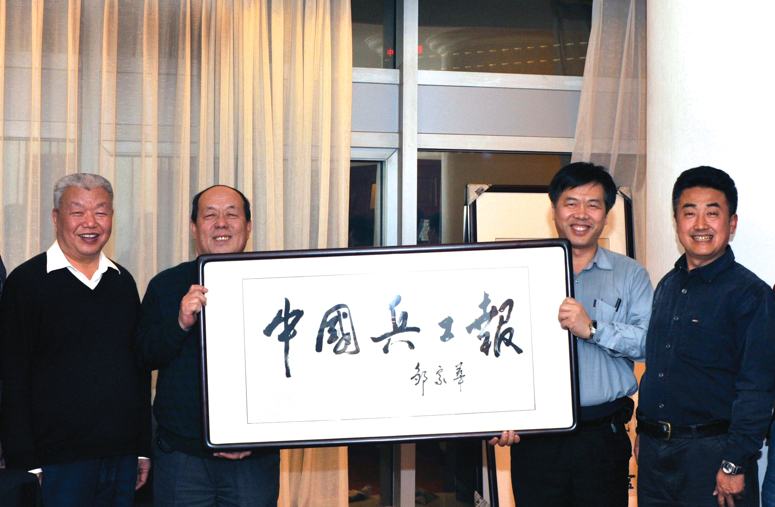 1994年11月14日,原兵器工業總公司總經理張俊九致函時任中共中央政治局委員、國務院副總理鄒家華,懇請他為《中國兵工報》題寫報紙名稱。鄒家華對兵器工業格外關心,第一次為軍工行業即將創刊的報紙題寫報名(見報紙刊頭)并題詞:軍民結合經驗多,交流信息效益升(見下圖)。