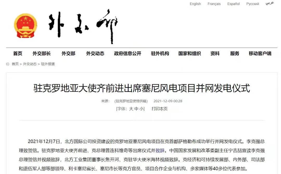 2021年12月7日,中國兵器工業集團有限公司北方公司所屬北方國際投資、建設和運營的塞尼156MW風電項目在克羅地亞首都薩格勒布隆重舉行并網發電儀式。李克強總理致賀信??肆_地亞總理安德烈·普連科維奇,中國駐克羅地亞大使齊前進出席儀式并致辭。中國國家發展和改革委員會副主任寧吉喆宣讀李克強總理賀信并視頻致辭,中國兵器工業集團有限公司董事長焦開河、克駐華大使米海林視頻致辭。 中華人民共和國外交部報道 普連科維奇總理在致辭中表示,感謝李克強總理發來賀信,他與中國領導人一直非常重視塞尼風電項目投資與建設。祝賀項目克服疫情與地震等影響,成功并網發電。增加清潔可再生能源、綠色電力對克乃至歐洲都很重要,克政府的重要戰略和目標之一就是低碳發展和增加清潔能源供應。塞尼風電項目占克總發電量將達3.5%,對克實現2022年可再生能源比例30%目標具有很大幫助。此次投資使北方國際成為在克最大的清潔能源投資企業。非常歡迎更多中國企業擴大對克投資。 寧吉喆宣讀李克強總理賀信并視頻致辭時表示,2017年11月第六次中國—中東歐國家領導人會晤期間,在李克強總理和普連科維奇總理等中東歐16國領導人的共同見證下,塞尼項目簽署了協議。項目既是中國堅定踐行綠色發展理念的具體體現,也是中國深化與克羅地亞、與中東歐國家務實合作的生動實踐。希望中克兩國政府部門,企業等有關各方共同努力、相互配合,運營好塞尼項目,打造出中歐綠色合作的樣板,帶動兩國務實合作持續深入發展,造福兩國人民。 焦開河在致辭時表示,在塞尼項目投入運營之際,李克強總理專門致信祝賀。作為塞尼項目的投資方、建設方、運營方,我們備受鼓舞,深感自豪!未來,中國兵器工業集團有限公司將繼續深入貫徹落實習近平總書記重要指示批示精神和李克強總理賀信重要要求,以高標準、可持續、惠民生為目標,與克方合作伙伴坦誠溝通、攜手并進,進一步推動綠色能源建設,努力打造更多的“一帶一路”標志性、引領性、示范性項目,為鞏固中克戰略合作伙伴關系、推進中克從經貿領域到全方位合作貢獻積極力量。 齊前進祝賀塞尼風電項目順利完工和成功并網發電。他表示,塞尼風電站項目并網發電是中克兩國領導人親自關注和推動的成果。作為迄今最大的中國在克投資合作項目,塞尼風電項目是中克和中歐綠色合作的典范,對克提高清潔能源生產消費發揮著重要作用。項目建設過程中為當地培養了許多工程、技術和管理人才,帶動了當地企業發展,增加了就業和稅收,促進了當地經濟社會發展,充分體現了中國對外經貿合作與“一帶一路”倡議秉持的互利共贏、共同發展的理念,也是中國積極倡導的綠色低碳發展合作的典范。 塞尼項目位于克羅地亞中部亞得利亞海沿岸,建設總投資1.79億歐元,總裝機容量156MW,采用39臺4MW風力發電機組設備,風場面積達42.8平方公里。項目正式運營后,預計每年平均發電超3000小時,貢獻約5.3億度綠色電力,可減少二氧化碳排放約46萬噸,將為克羅地亞促進能源轉型、發展綠色經濟提供強勁助力,貢獻了“中國智慧”“中國方案”。 來源/中華人民共和國外交部、綜合有關報道 |
