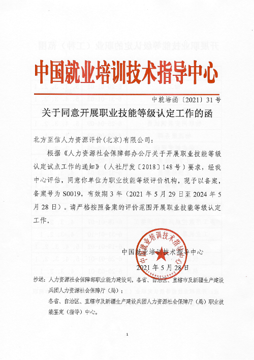 5月28日,人力資源社會保障部中國就業培訓技術指導中心發布了《關于同意開展職業技能等級認定工作的函》(中就培函〔2021〕31號),北方至信人力資源評價(北京)有限公司(以下簡稱“北方至信”)成為首家央企全國性社會培訓評價組織職業技能等級認定機構。