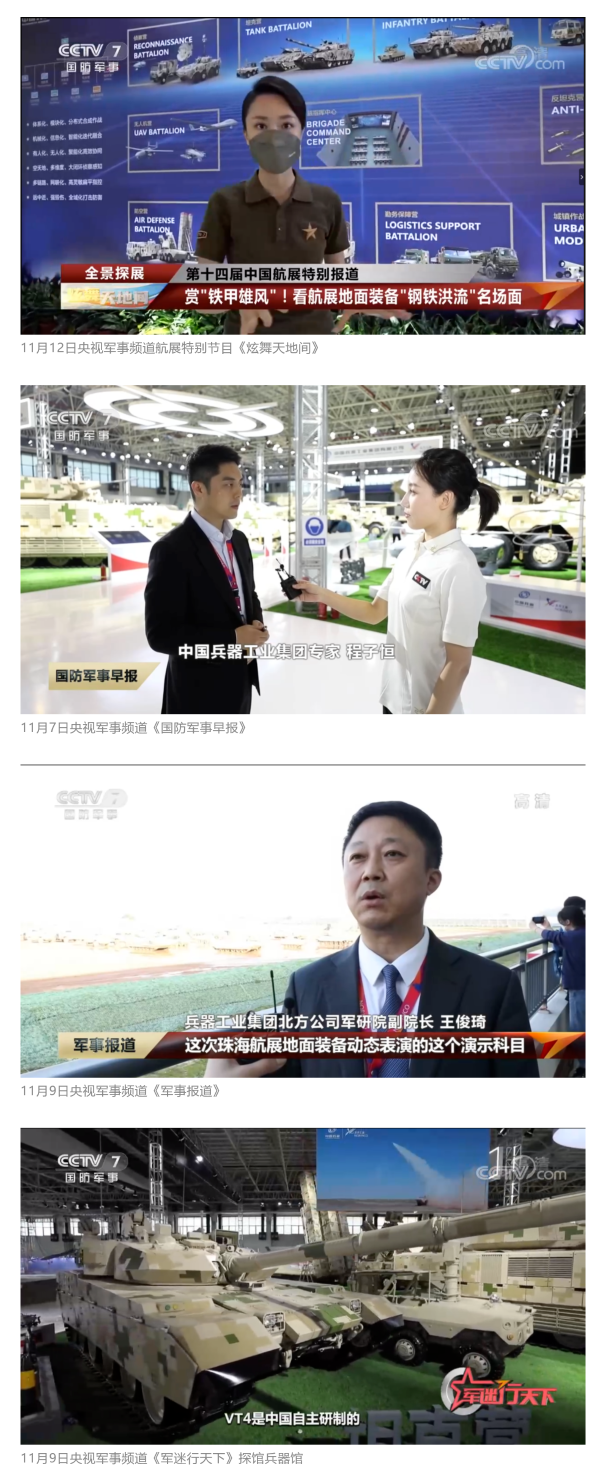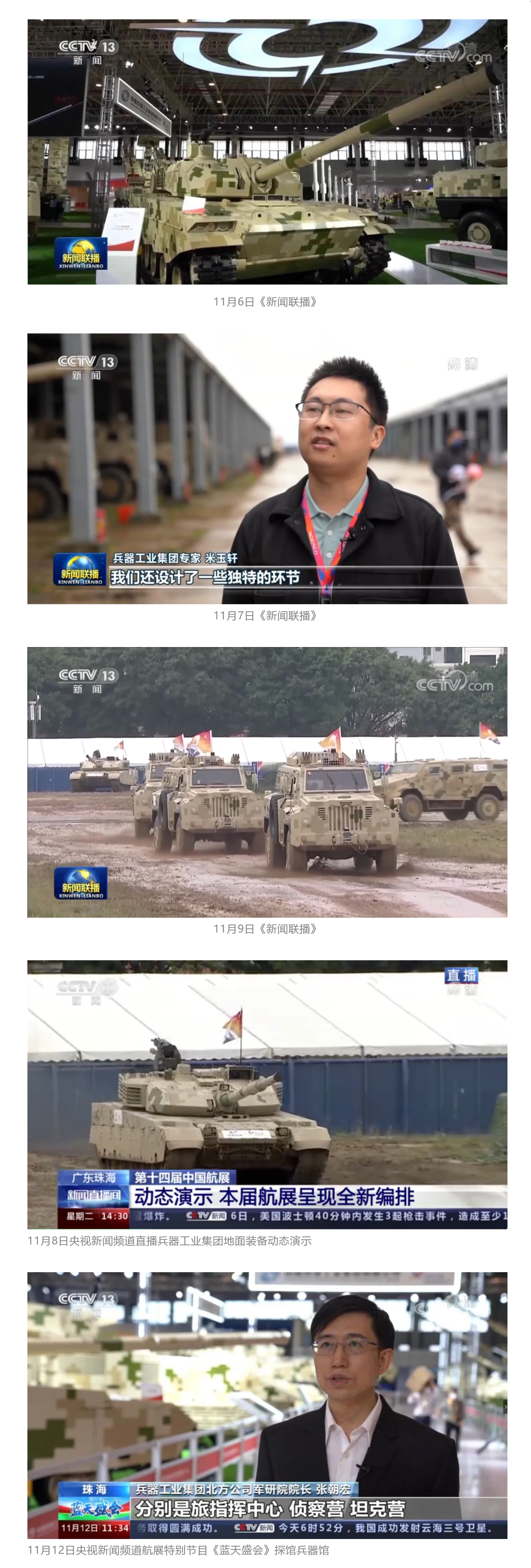 11月6日、7日、9日,央視《新聞聯播》三次報道兵器工業集團參展情況,重點介紹了集團公司總體參展情況、地面裝備動態演示全新編排、國產輪式反伏擊車首次采用有人駕駛和無人駕駛混合編隊等內容。11月8日,央視新聞頻道直播地面裝備動態演示;11月12日,央視新聞頻道航展特別報道《藍天盛會》探訪兵器館,采訪兵器工業集團嘉賓對陸軍合成旅作了報道。
