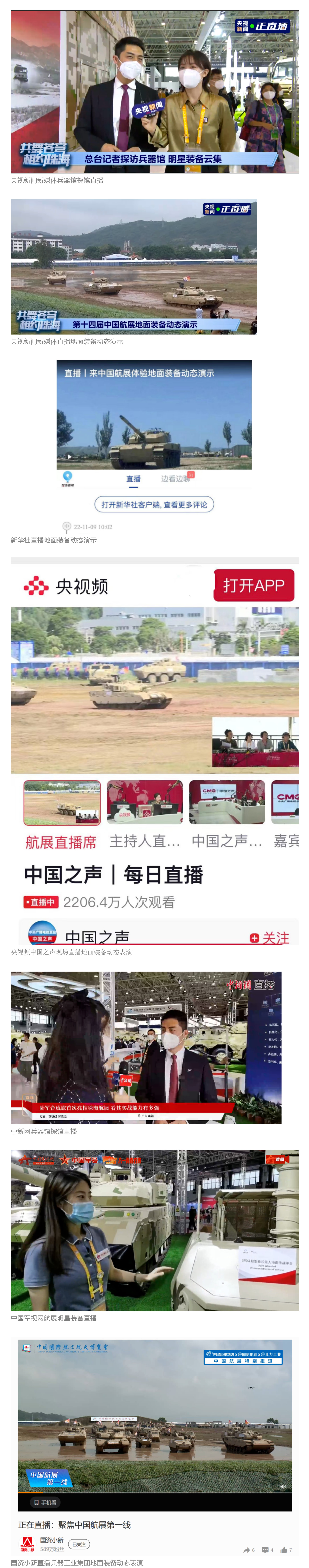 央視新聞新媒體、央視頻中國之聲、新華社、中國新聞網、中國軍視網、CGTN(微博、臉書、推特)等媒體以及國資小新、共青團中央、鳳凰軍事等到兵器工業集團地面動態演示區、中國兵器館進行了直播。航展期間,集團公司微信視頻號、微博、抖音號、快手號共進行8次直播,最高觀看人數突破24萬。