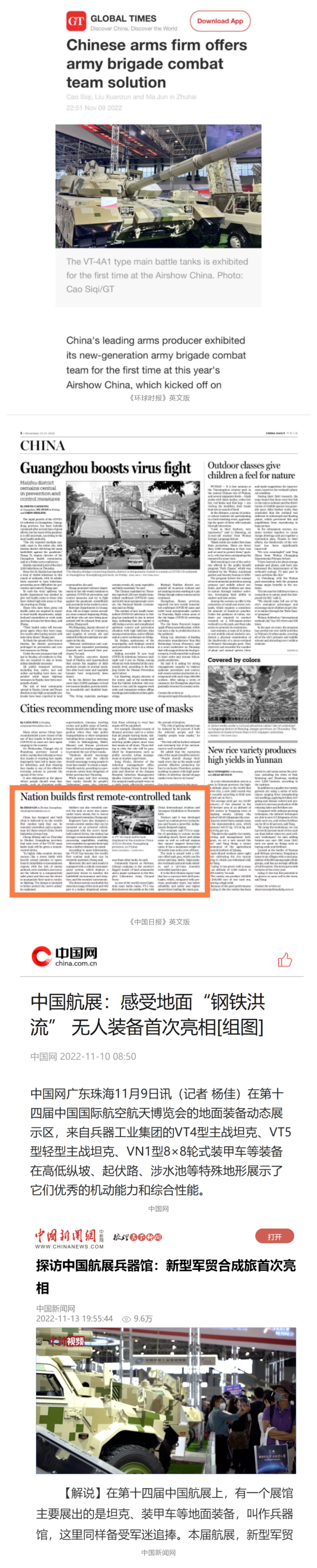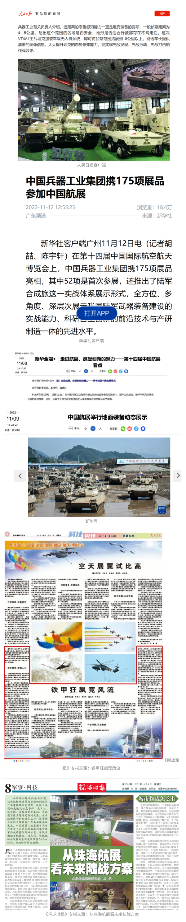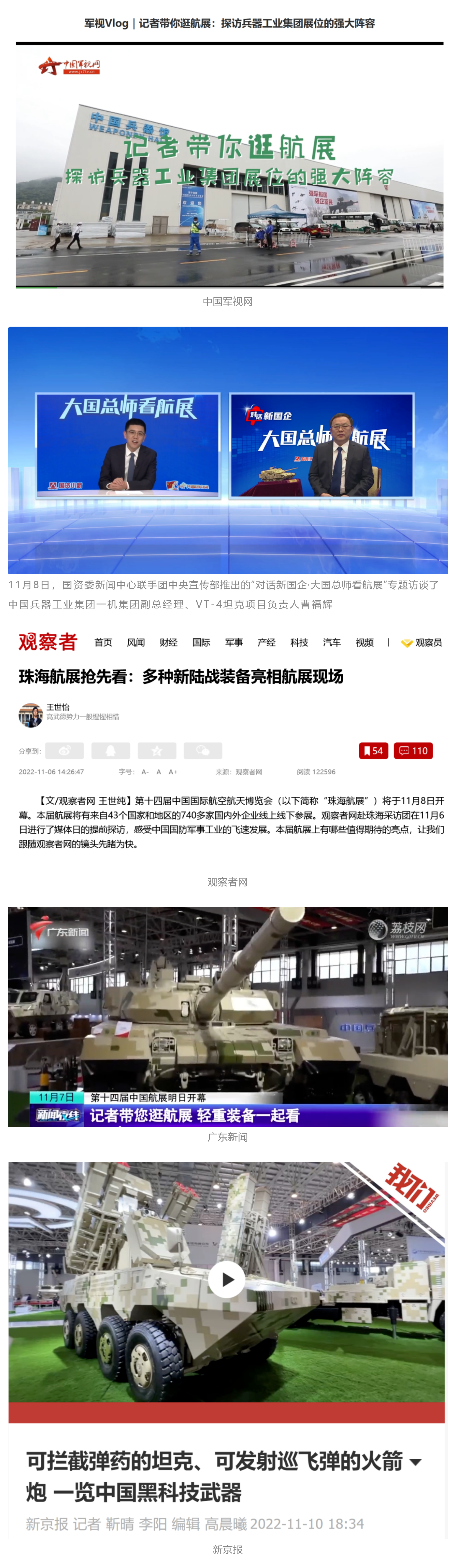 央視國防軍事頻道航展特別報道《炫舞天地間》11月12日《賞“鐵甲雄風”!看航展地面裝備“鋼鐵洪流”名場面》對兵器工業集團武器裝備特色亮點進行報道。《國防軍事早報》11月7日推出報道《第十四屆中國國際航空航天博覽會明天開幕 中國兵器館首次以陸軍合成旅實戰體系形式展出》,對兵器館陸軍合成旅實戰體系進行報道。《軍事報道》11月9日推出《第十四屆中國國際航空航天博覽會 地面兵器裝備首次聯合陸航直升機進行動態展示》報道。《軍迷行天下》11月9日推出報道《軍迷打卡航展2022》以專業軍迷視角探館兵器館,全面展示兵器工業集團參展裝備特色亮點。