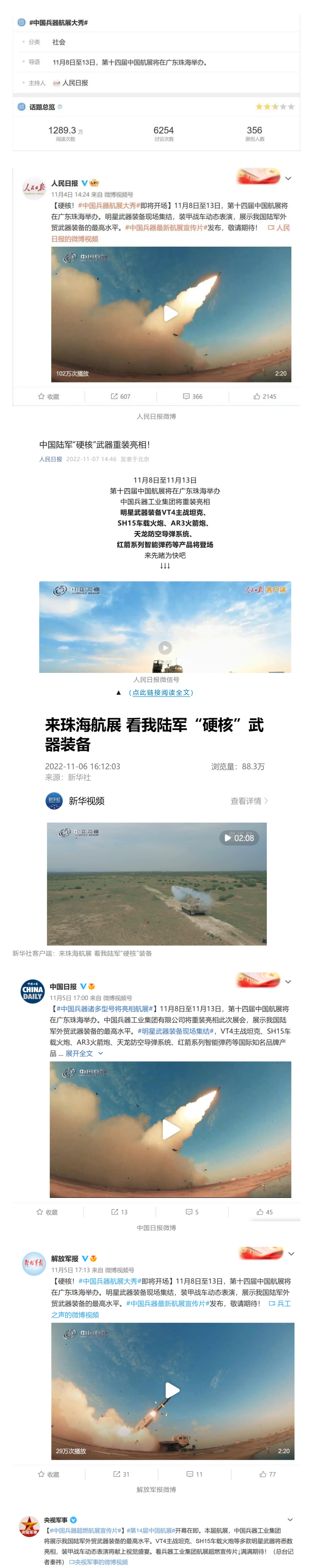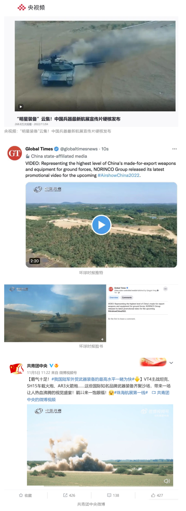 人民日報官方微博、微信公眾號,新華社客戶端、央視新聞客戶端、中國日報微博、參考消息微信公眾號、解放軍報微博、央視軍事微博、CGTN微博、中國軍號微博、共青團中央微博、環球時報(英文網站、臉書賬號、推特賬號)、嗶哩嗶哩、學習強國平臺、國資小新視頻號、網易軍事、騰訊軍事、鳳凰軍事、北京日報、東方衛視看看新聞全媒體、北京電視臺等20余家中央主流媒體、國家部委、省市媒體的新媒體第一時間播發集團公司航展宣傳片等視頻作品燃爆全網,累計閱讀量突破1700萬人次。集團公司微信公眾號、微博、抖音號、快手號、微信視頻號、知乎號等新媒體宣傳片播放閱讀量超過800萬人次,點贊超過30萬人次。集團公司微信公眾號推出《硬核!中國兵器最新航展宣傳片發布》《中國兵器航展節目單,請選出心中明星裝備》《航展首日,中國兵器閃耀亮相!》等7篇報道,閱讀量超過25萬人次,集團公司微信視頻號、抖音號、快手號等新媒體賬號發布“中國兵器航展大秀”系列視頻,觀看量超過330萬人次。