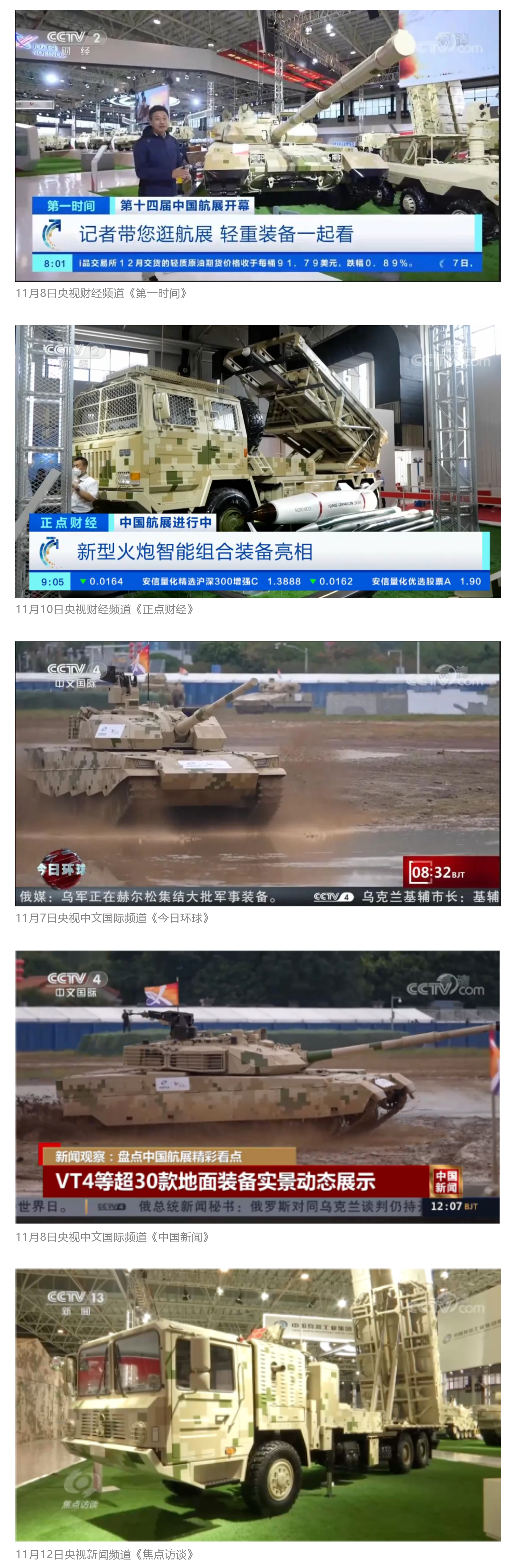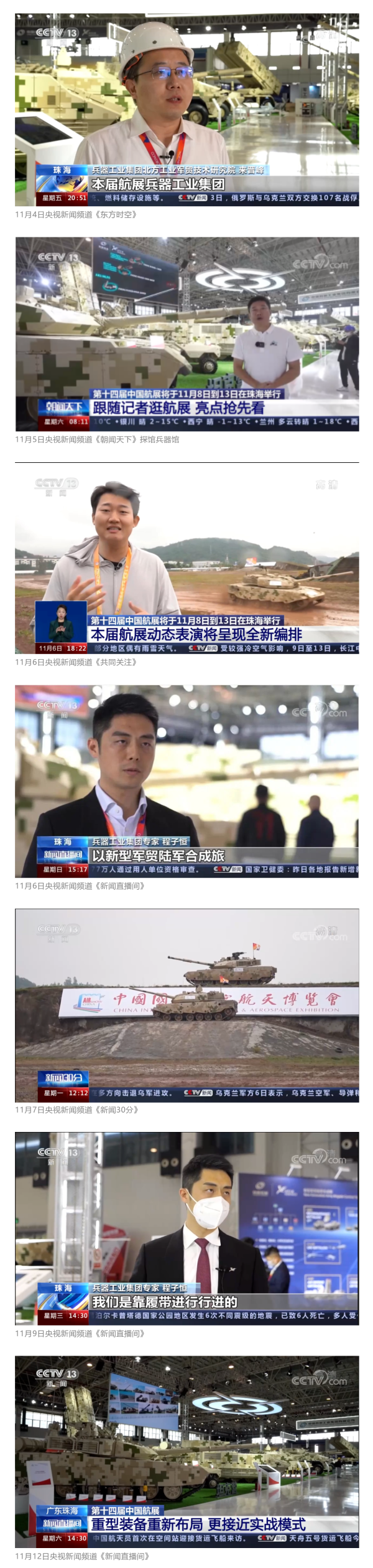 此次航展,央視新聞頻道《朝聞天下》《新聞直播間》《東方時空》《共同關注》《新聞30分》《24小時》、央視國防軍事頻道《國防軍事早報》《軍事報道》《軍迷行天下》、央視國際頻道《中國新聞》《今日環球》等欄目共播出兵器工業集團參展相關新聞報道30余條。