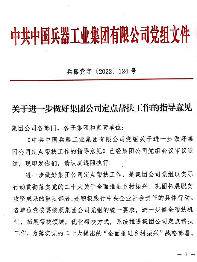 2022年,根據《中共中央 國務院關于實現鞏固拓展脫貧攻堅成果同鄉村振興有效銜接的意見》《關于堅持做好中央單位定點幫扶工作的意見》等規定,兵器工業集團黨組制訂印發《關于進一步做好集團公司定點幫扶工作的指導意見》,形成“1+8+5”兵器特色定點幫扶工作體系。“1”,即圍繞“助力全面推進鄉村振興、建設宜居宜業和美鄉村”定點幫扶要求,“8”,即“加強系統策劃、完善幫扶長效機制,發揮比較優勢、助力鄉村產業振興,增強內生動力、助力鄉村人才振興,培育文明新風、助力鄉村文化振興,踐行‘兩山’理論、助力鄉村生態振興,加強基層黨建、助力鄉村組織振興,鞏固脫貧成果、加大消費幫扶力度,選派掛職干部、立足鄉村建功立業”等八項重點任務,“5”,即加強組織領導、落實幫扶資金、做好宣傳引導、增進工作交流、強化考核評價等五方面工作保障。