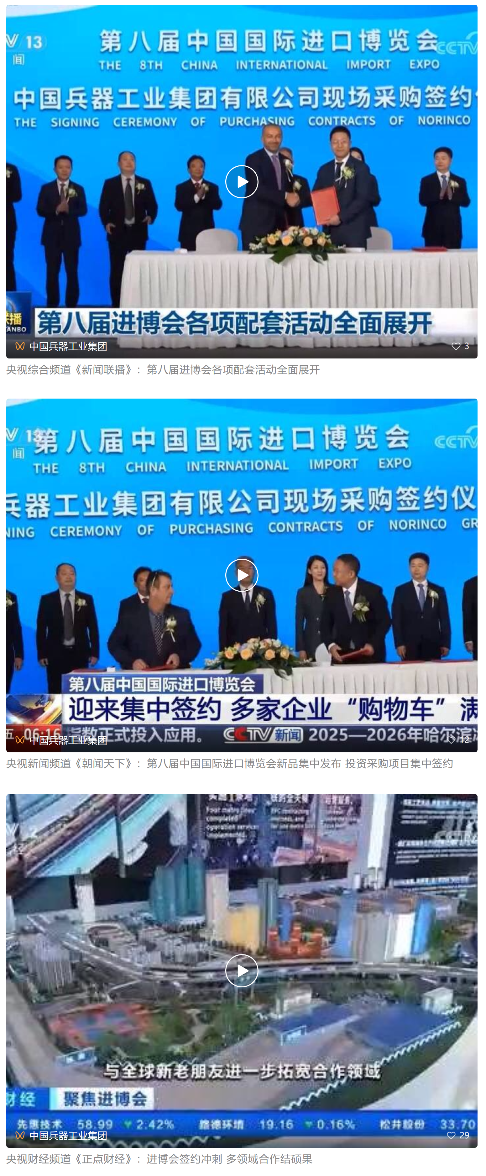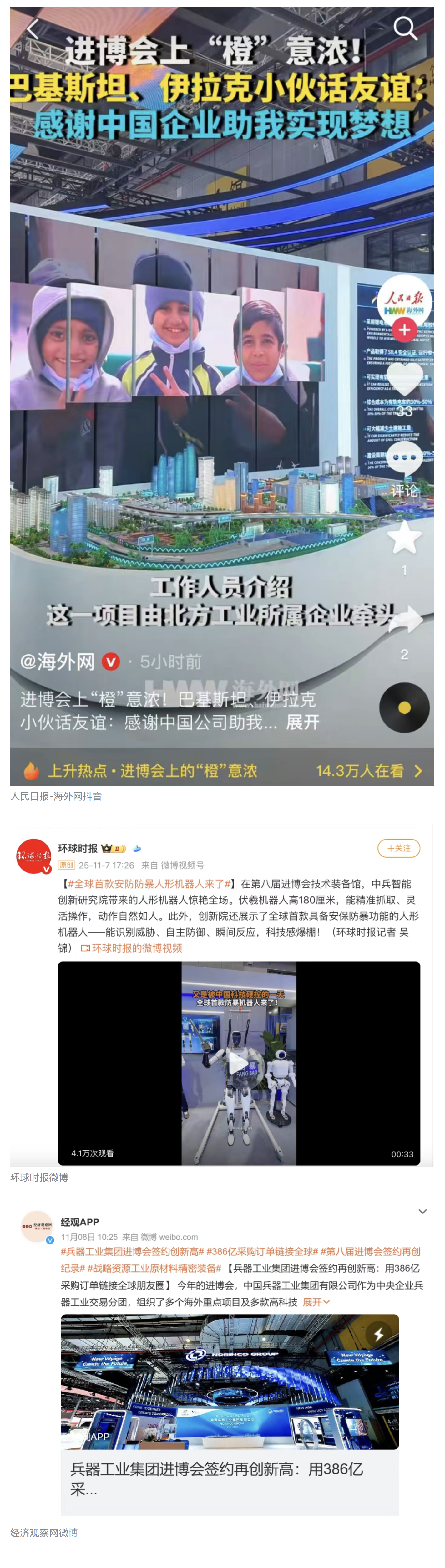 在微博、抖音等新媒體平臺上,集團公司高科技產品演示、5D穹幕電影體驗等短視頻持續引爆流量,累計播放量超800萬次,點贊量破50萬。“兵器工業集團進博會簽約386億”相關話題登上微博熱搜榜,閱讀量破5000萬次。