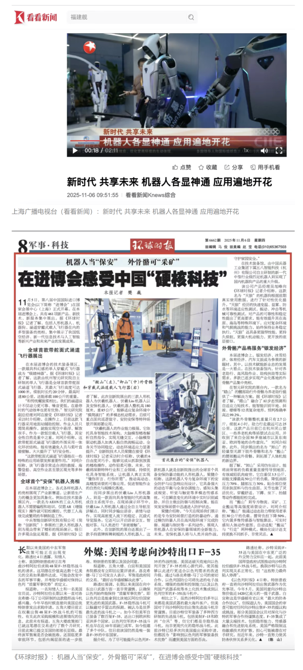 《環球時報》、環球網、《新京報》、《中國旅游報》等對集團公司人形機器人、四足機器人、涵道穿戴式載人飛行器、外骨骼等多型新域新質產品,集中亮相進行報道。新華社、央廣中國之聲、新京報(貝殼財經)、上海廣播電視臺等媒體直播探館,打卡兵器“硬核科技”。
