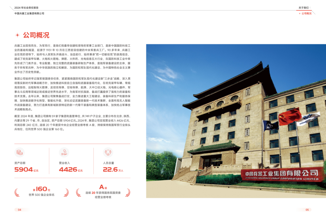 近日,中國兵器工業(yè)集團有限公司正式發(fā)布《中國兵器工業(yè)集團有限公司2024年度社會責任報告》。本次報告是集團公司第16份年度社會責任報告,從堅守強軍首責、服務(wù)經(jīng)濟建設(shè)、共創(chuàng)美好生活三個維度,全面展示集團公司履行社會責任的實踐與成效。經(jīng)中國企業(yè)社會責任報告評級專家委員會評定,《報告》獲得“五星佳”最高評級,成為軍工行業(yè)唯一一家連續(xù)6年獲此殊榮的中央企業(yè)。 兵器工業(yè)集團2024年度社會責任報告 部分內(nèi)容摘錄 ↓↓↓ 文/社會責任部 |
