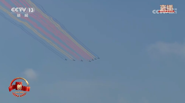 由殲10表演機發射的固體彩色發煙彈劃出14道彩煙,絢麗奪目、驚艷全場,寓意著中華民族14年可歌可泣的抗戰歷程,象征著14億多中國人民奔向強國復興的絢麗前景。該型固體彩色發煙彈拉出的紅、黃、藍三種煙帶飽和鮮亮、形態穩定、邊界清晰,滯空時間長達數十秒不消散,同時安全環保、使用可靠、操作便捷。